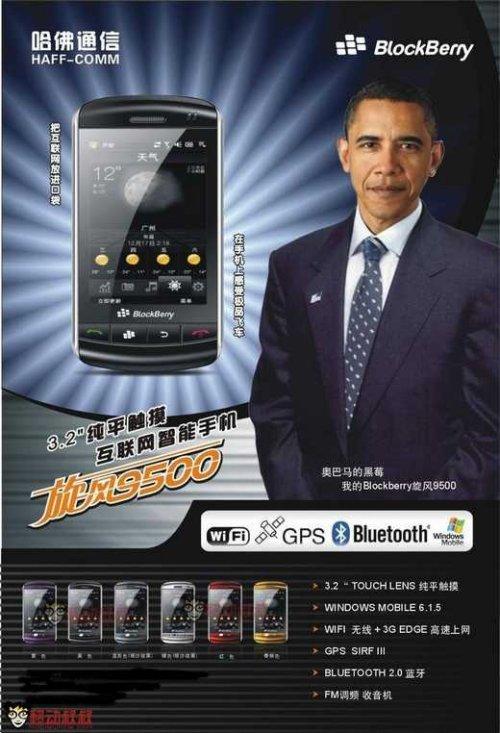 據(jù)國(guó)外媒體報(bào)道,中國(guó)一家名為“哈佛通訊(HAFF-COMM)”的山寨手機(jī)廠商發(fā)布了一款RIM黑莓(BlackBerry)山寨機(jī)”BlockBerry旋風(fēng) 9500“,令人意外的是,美國(guó)總統(tǒng)奧巴馬(Barack Obama)竟然出現(xiàn)在該款手機(jī)的宣傳海報(bào)上。