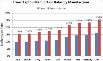 整體而言,在三年內(nèi),25%的上網(wǎng)本會(huì)出現(xiàn)故障,而入門(mén)級(jí)筆記本的故障率為20.6%,高端筆記本故障率為18.1%。