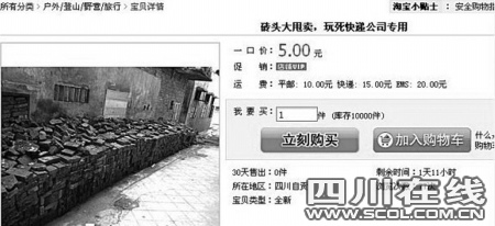 近日,店主“千尋kission”在淘寶網上發布了“磚頭大甩賣,玩死快遞公司專用”的銷售標題,表示將以5元一斤的價格販賣磚頭。其中的產品說明還頗有幾分《武林外傳》中呂秀才的風采:“泄憤也可用磚頭,本磚頭專為對付那些服務態度不好的快遞送貨員設計,如果你們對那些惹您生氣的快遞員投訴無門,無處泄憤請拍下此產品。”