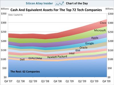 Capital IQ數據顯示,這10大科技公司擁有2100億美元現金和等價物,在過去2年中,這10家科技公司的現金和等價物增加了687億美元。