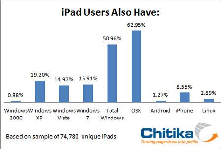 Chitika對7萬多名iPad用戶進行了調查,結果發現有50.96%的用戶使用Windows系統。當然,使用Mac OS系統的iPad用戶略占上風,比例為62.95%(部分用戶使用雙系統)!
