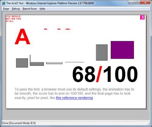 同時(shí),微軟還提供了IE9第二預(yù)覽版的一些測(cè)試結(jié)果。在Acid 3測(cè)試中,新版瀏覽器得到了68分,高于首個(gè)版本。