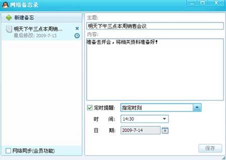 很多朋友都有“健忘”的小毛病,一些不重要的事情忘了倒沒什么,公司的一次重要會議要是忘記了,后果就嚴重了!QQ2009中內置了網絡提醒功能,可以將一些重要事件提前添加到提醒列表中,這樣就不會因小毛病而誤了大事。單擊主面板中的“菜單→工具→網絡備忘錄”,在打開的窗口中設置好具體的提醒內容及提醒時間即可。提醒的時間可以具體到某個點也可以設置每天、每周的某個固定時刻的提醒。如果是QQ會員,還可以設定“自動漫游”,這樣在任何一臺可上網的電腦中,之前設定的網絡提醒都有效。
