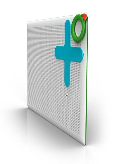 背部配有攝像頭,感應充電器,一個角上還安裝了可以折疊的圓環式拎手。在厚度上,只有iPhone手機的1/2。OLPC計劃于2012年推出該款產品,價格預計為75美元。