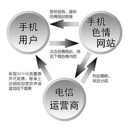 “簡單來說,一條手機色情信息內容的發布,一般要經過三個環節:運營商(主要是指各種手機圖片、鈴聲、視頻、文字、游戲等內容發布平臺和渠道的提供者)、SP和WAP網站!北本┼]電大學一個曾長期關注移動增值業務的人透露,“SP在運營商和WAP網站間牽線搭橋,三者已形成捆綁各方的利益鏈,一旦獲利,三方都有收益!