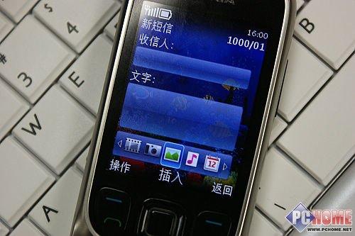 在短信輸入的設計上,6303C將短信和彩信的模塊合并在一起,我們注意到在文字輸入區域下方,就是插入多媒體資料的圖標,由此將短信自動切換為彩信,應用非常方便。6303C還是沿用了傳統的T9輸入法,相比全鍵盤的機型來說,數字鍵盤輸入速度一般,但它的按鍵的手感不錯,長時間使用并不會覺得疲憊。