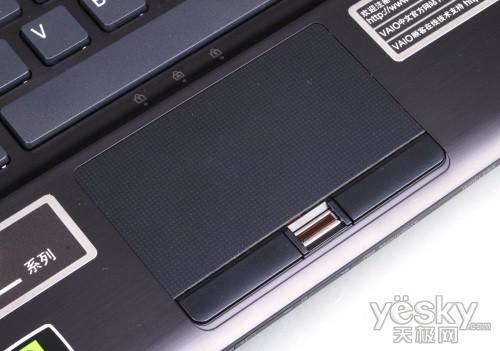 觸摸板區域設計寬大,表面附了一層采用了磨砂處理的塑料材質,同時為了增加手感表面還加了一些微小凸點的膜。左右按鍵被設計成狹長的外形,用手按下去的觸感非常好,彈性好并且省力。雖然還是不如一些商務本的指點桿操控,不過對于一些初級用戶來說,還是觸摸板更容易使用。另外,左右按鍵中加入了指紋識別器,對于一些比較注重安全的商務用戶來說還是非常有必要的。