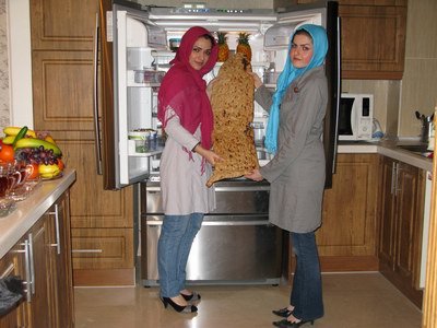 然而,直徑足有60厘米、比臉盆還大一圈的大馕餅在存儲時卻一直困擾著伊朗人。因為出鍋時間一長,馕餅就干得像石頭一樣堅硬,所以當地人就想到用塑料袋包起來放進冰箱里保存,這樣吃的時候還會柔軟猶如剛出鍋。但這樣又誕生了新的問題,因為傳統冰箱空間局限,巨大的馕餅只能切割成小塊再保存,這樣又會影響到馕餅醇厚彌久的口感。