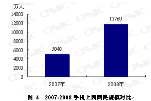 中國互聯網絡信息中心(CNNIC)今天下午在京發布的《第23次中國互聯網絡發展狀況統計報告》透露,截至2008年,使用手機上網的網民達到1.176億人,較2007年增長一倍多。