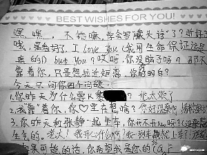中學生,甚至是小學生的“早戀”已不是什么值得大驚小怪的事情了,然而在看了網友“typhooncome”于日前發出的“雷死人的六年級小學生的字條”一帖中,幾張兩個六年級小學生互相“傳遞愛語”的字條后,記者還是著實被雷了一把,其中的內容和用詞就如發帖者所說的一樣“非常非常雷人”。