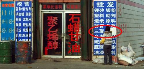 記者在一家化工店招牌上發(fā)現(xiàn)三聚氰胺字樣,老板解釋現(xiàn)在早都沒(méi)賣了