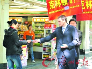 昨日,一位名叫“克林頓”的人在東莞街頭給消費者免費派發其代言的安全套(見上圖)。不過,這位“克林頓”可不是前美國總統比爾·克林頓,而叫威廉·比利·克林頓,加拿大人。對于商家的宣傳手法,有市民質疑這是借美國前總統克林頓的名字來制造噱頭。(記者 周偉涵 通訊員 黃菲 攝)