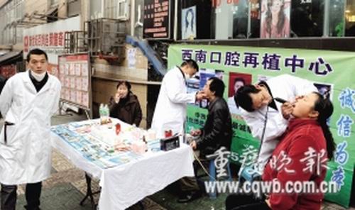 記者立刻前往調(diào)查,發(fā)現(xiàn)這三名中年男子身著白大褂,白大褂上印有“重醫(yī)大附二院”等字樣,面前的一張桌子上,擺滿了假牙、醫(yī)藥棉花和一些瓶瓶罐罐及資料。“我們都是大醫(yī)院的醫(yī)生,周末出來(lái)治病兼宣傳。”見(jiàn)一中年男子湊上來(lái),著白大褂的一男子立即熱情招呼,隨即拿起手術(shù)鉗就往患者口腔里插。