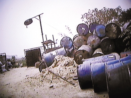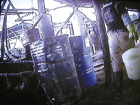 昨天下午,羊城晚報(bào)記者以收購(gòu)“潲水油”為名,進(jìn)入該家煉油窩點(diǎn)。從泰龍工業(yè)園附近的一條小路拐入,穿過(guò)鐵路涵洞不到100米即到,門口以竹柵欄做門,未見(jiàn)廠名或掛任何招牌,卻用木桿高高掛起一個(gè)油桶。人一走近門口,一陣難聞的餿臭味便迎面撲來(lái),入門左側(cè)堆放了幾十個(gè)空油桶,還有一堆堆榨剩的油渣。場(chǎng)內(nèi)中央并排連著十幾個(gè)大水泥池,池內(nèi)裝填有大量剩飯剩菜等食品垃圾,空氣里彌漫著惡臭,令人掩鼻;再往里走,是一架帶有發(fā)動(dòng)機(jī)的簡(jiǎn)陋榨油機(jī),機(jī)器轟鳴聲中,不斷有深黃色的油液被擠出,滴到榨油機(jī)下方的一個(gè)槽里;旁邊還有幾個(gè)貌似用作煮油的圓筒裝置,周圍油污滿地。記者現(xiàn)場(chǎng)看到,場(chǎng)內(nèi)沒(méi)有一間固定建筑,全是用木頭、鎂瓦搭建起來(lái)的粗陋臨時(shí)棚寮。