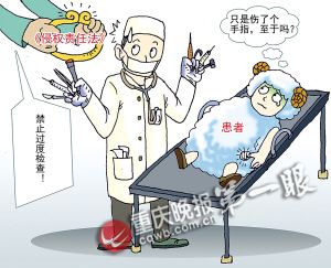 “下月起,醫院再對患者進行過度檢查屬于違法!敝貞c合縱律師事務所徐桂鵬律師介紹,《侵權責任法》7月1日起正式施行,該法對過度檢查作了明確禁止性規定。