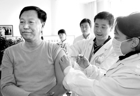 長春市自10月20日開始接種甲型流感疫苗以來,國家撥給長春市的13萬余人份疫苗只接種了72000余人份。第一批疫苗接種率不到60%,一個很重要的原因就是有的市民還心存顧慮。為了消除市民的顧慮,昨日上午,長春市市長崔杰等市領導接種了甲流疫苗,在場的媒體記者也進行了接種。