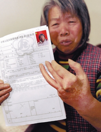 若干年前的一次工傷,讓沈河區(qū)北二經(jīng)街的居民王桂蘭成為國家三級肢殘。但這一事實在上周五被“改變”了,在經(jīng)歷了一次新殘疾證換證的例行體檢之后,60歲的王桂蘭被醫(yī)生告知,她已經(jīng)是“正常人”了。這一結(jié)果讓王桂蘭大惑不解,她舉著殘廢的左手質(zhì)問醫(yī)生,“為啥?”醫(yī)生回答:“你必須手指頭全沒了才能算殘疾。”