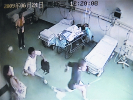 監控錄像中顯示:一名光頭男子逃進搶救室,兩名男子持刀一路追砍(見圖),在搶救室一角將其砍成血人才罷休。行兇幾分鐘后,6名砍人兇徒從容走出醫院,沿香江花園路口向三眼橋方向逃走。傷者隨即被送進十一醫院手術室,搶救后一人傷勢嚴重被轉往協和醫院治療。