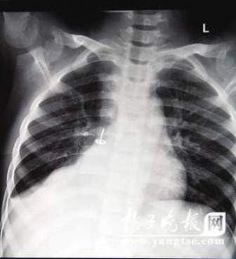 小杰的母親告訴記者,他們一家來自安徽明光,自己和孩子的父親都在外打工,小杰從小就由爺爺奶奶照顧。從去年夏天開始,爺爺奶奶就告訴他們,小孩身體不好,總是感冒咳嗽。后來發展到幾乎每隔一個星期,小杰就感冒發燒。從上個月中旬開始,小杰連著幾天發低燒,掛了幾天水都壓不下來,長輩們很擔心,就把小杰的媽媽喊回家里。小杰的媽媽想,孩子反復感冒也不是個事兒,于是就把他帶到南京,想找個專家好好看看。到了南京市兒童醫院,醫生詢問病史后,建議孩子做一個胸片看看。結果片子一出來,所有人都嚇了一跳,孩子的肺里有一個明顯的金屬物,看這形狀,不就是一個圖釘嗎!在家長的追問下,小杰才吞吞吐吐地說,去年3月的一天,他把圖釘含在嘴里面玩,結果一不小心就吸了下去。但是據孩子自述,就剛一開始有點疼,過了一會就沒有感覺了。因為怕被家長教訓,他一直沒敢吱聲。