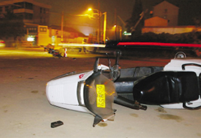 記者當晚趕到現場時,潘女士已去醫院就診,一名腿部受傷的男子正坐在路邊休息。只見地上躺著一輛電動車和一輛摩托車,電動車旁邊已被接警前來的派出所民警放置了一個警示標志,民警同時還將警燈打開,提醒過往的電動車和摩托車減速行駛。
