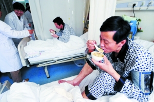 孫萍表示,病人的恢復進程較快。6日,為了促進消化,他們的食物以“湯水”等流質為主;7日午飯時,醫生就開始為部分病人喂食湯面等半流質食物。為了增加營養,加快身體恢復,醫生對他們實行“一日七餐制”。