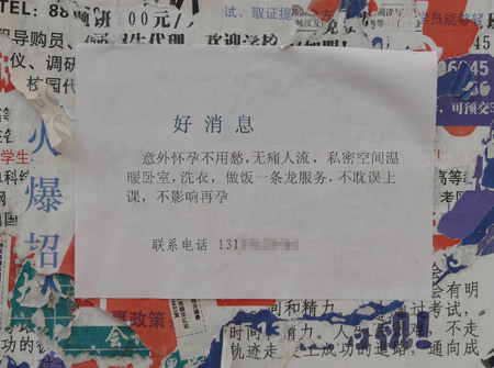 而記者在某高校內發現,校內的廣告欄上竟有專為做過人流的女大學生服務的月嫂廣告。