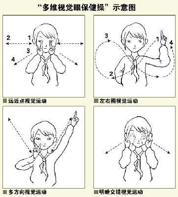 據介紹,“多維視覺眼保健操”時長5分鐘,分“遠近點視覺運動”、“左右圓線視覺運動”、“多方向視覺運動”、“明暗交替視覺運動”4節。做操時,或雙手食指豎起,向前后上下左右方向伸出,或單手在眼前畫8字;眼睛始終盯著手指,隨著手指運動調整目光。