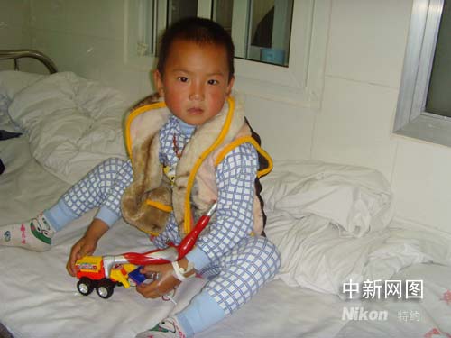一名康復兒童在病床上高興地玩著手中的汽車玩具。張杰 攝