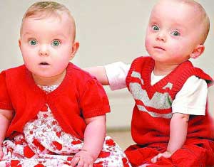 2007年5月,英國斯塔福德郡巴頓特倫特市一對夫婦生下了一對體重相差1倍的“奇跡雙胞胎”,當弟弟詹姆斯·懷特生下來時,體重竟然只有孿生姐姐哈麗特一半大!令人欣慰的是,13個月后,這對“大小雙胞胎”已長成了差不多同樣大小的健康嬰兒。