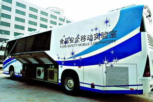 食品安全移動實驗室,到底是個什么樣子?單從外觀來看,這就是一輛普普通通的12米長的大客車,只是客車外噴上了藍色的“食品安全移動實驗室”的字樣。車廂里可是“麻雀雖小,五臟俱全”,擺放了各種精密儀器、試管、量杯……