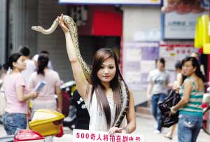 這名自稱叫“優(yōu)優(yōu)”的年輕女子說,她今年22歲,陜西人,曾是專業(yè)舞蹈演員。她從小不怕蛇,3年前自己養(yǎng)起了蛇,剛開始由于缺乏專業(yè)養(yǎng)殖知識,死了好幾條蛇,她為此十分難過,F(xiàn)在她對“蛇性”相當了解,還學起了蛇舞、印度舞、肚皮舞。優(yōu)優(yōu)指指脖子上的蛇稱,這是條緬甸蟒,10多斤重,進食胃口很大,不僅要吃豬肉,而且一次能吃七八只和鴿子差不多大小的鳥。由于養(yǎng)蛇,這幾年來優(yōu)優(yōu)一直單獨一人居住,“沒幾個人不怕蛇的,我只能帶著蛇單獨過。”帶蛇來“逛”山西路,優(yōu)優(yōu)另有目的,她背后的胡導稱,他計劃花5年時間搜集500個奇人,拍攝奇人喜劇電影,讓他們展示各自絕技,目前有人愿出數(shù)百萬拍攝。