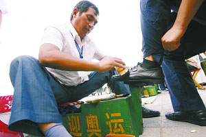 昨日下午,侯現中在水立方西門附近為游客免費擦鞋。本報記者 孫純霞 攝
