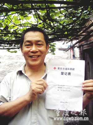 蔣必忠的愿望在7月24日這天變成了現(xiàn)實(shí)。那天下午,當(dāng)他躺在病床上,用顫抖的右手在那張《重慶市遺體捐獻(xiàn)登記表》上歪歪斜斜簽下自己的名字后,他長長地舒了口氣。就這樣,這個(gè)59歲的直腸癌晚期患者,成為在北碚區(qū)紅十字會登記的首個(gè)農(nóng)民遺體捐獻(xiàn)者。