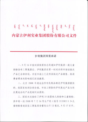 一、16日接到國家質(zhì)檢總局通知伊利集團一款兒童奶粉含有三聚氰胺后,伊利集團在第一時間內(nèi)將市場該批次產(chǎn)品已全部回收,目前市場上已沒有該批次產(chǎn)品銷售。給消費者帶來的影響我們深表歉意。