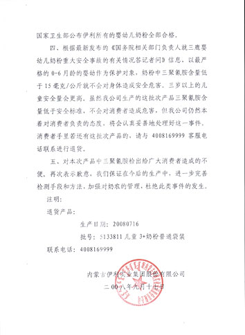 四、根據(jù)最新發(fā)布的《國務院相關部門負責人就三鹿嬰幼兒奶粉重大安全事故的有關情況答記者問》信息,以最嚴格的0-6月齡的嬰幼作為保護對象,奶粉中三聚氰胺含量低于15毫克/公斤就不會對身體造成安全危害。三歲以上的兒童安全量會更高。雖然我公司生產(chǎn)的這批次產(chǎn)品三聚氰胺含量低于安全標準,不會對消費者造成危害,但我公司仍然本著對消費者負責的態(tài)度,將會認真妥善地處理好這一事件。消費者手里若還有這批次產(chǎn)品的,請與4008169999客服電話聯(lián)系進行退貨。