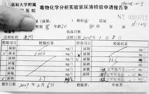 當(dāng)時正患重度蕁麻疹的他,在看帖子的當(dāng)天就到醫(yī)院打麻藥拔掉了3顆烤瓷牙。第二天,又專門請假到朝陽醫(yī)院做尿鎳測試。幾天后,他拿到了一份讓他“一下子懵了”的報告單,單子上顯示:他尿液中的鎳含量為144個單位!