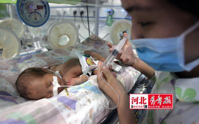 昨日,記者在醫院的新生兒監護病房看到,三個小男孩兒都躺在保溫箱里。據兒科醫生介紹,三個孩子都是低體重早產兒,出生時孕周為33周多。老大是1.58公斤,老二和老三是1.55公斤,自3月16日出生到現在已經度過了呼吸關,還有感染關、喂養關、黃疸關在等待著他們。這兩天護士已經開始通過鼻飼管注射給他們喂奶了,三個孩子每次分別給注射7毫升、3毫升和4毫升,2個小時喂一次。從目前來看,除老大有點貧血外,三個孩子心肺功能腦部發育都很好,預計還有2到3周孩子們才能出保溫箱。