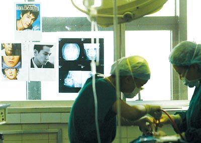 昨日,某醫院,香港明星吳彥祖的海報貼在窗戶上,醫生正為王先生做手術記者 鄒飛 攝“顴骨千萬不要凹陷!盡可能讓臉窄!”昨日,本市某醫院整形科,一名高大、帥氣的男子持4張香港明星吳彥祖的海報,要求整成吳彥祖的樣子。據整形科吳主任介紹,本月已有兩個帥哥來醫院要求整成吳彥祖。