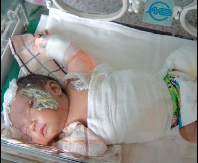 我的孩子啊,你才出生24天,你是如此的脆弱,還沒有來得及看這個世界,就受到如此非人的折磨,媽媽多么希望能代替你去承受這一切的災難與痛苦。當媽媽聽到你第一聲啼哭,當你第一次依偎在我懷里,心中歡喜之情無以言表,從此世間再沒有什么比你更重要,我還沒有來得及記住你可愛的笑容,你就已經面目全非了……一想到你將來不能像正常人那樣行走,不能像正常人那樣生活的時候,我就萬念俱灰,心如刀絞,你我該如何面對漫漫人生之路,我該如何向你解釋?這又是誰之過呢???