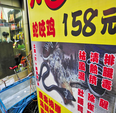 “打死我都不敢吃!”市民劉先生在黃泥塝看到某餐館推出的“蛇咬雞”招牌后說,這些吃法太怪了。劉先生介紹,招牌上還說,吃“蛇咬雞”可以醒腦、除雀斑、排臟毒、祛風(fēng)濕等。“這不僅太殘忍,太血腥,也不道德。”張女士說,希望這僅僅是個別餐館吸引顧客而搞的噱頭。