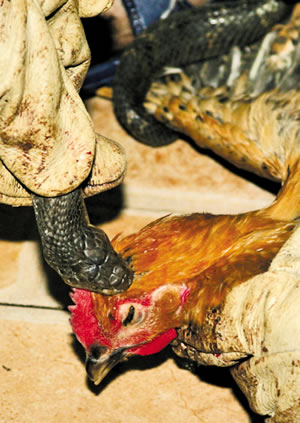 “表演馬上開始!”店里所有顧客都將眼光齊刷刷地盯著該男子的手。只見他左手將母雞死死按在地上,右手從鐵籠中隨手抓了一條長約1米的眼鏡蛇,用手卡住它的頸部。“啪、啪、啪!”只見男廚師不停地拍打著蛇的頭部,試圖激怒它,但眼鏡蛇仍一動不動。“怎么不咬呢?”幾名男子哈哈大笑,一些食客也一撥接一撥地走了進(jìn)來。