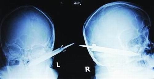 經(jīng)過檢查,醫(yī)生說這把長(zhǎng)有10厘米左右的刀,從右耳窩上前方直接刺進(jìn)了鼻腔,離頜內(nèi)大動(dòng)脈很近,刀卡在了骨頭中,要取出這把刀最怕大出血,萬(wàn)幸的是這把三棱刀并沒有傷及大腦。