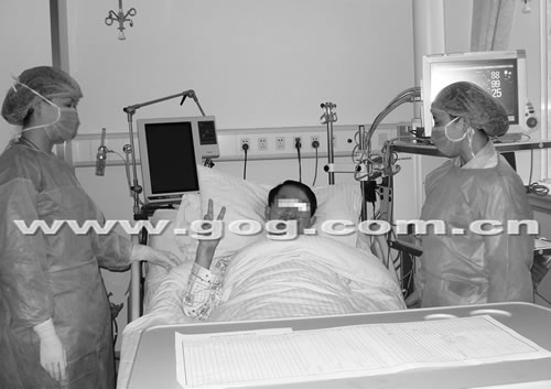 重癥監(jiān)護病房劉蘭主任醫(yī)師介紹說,周某剛轉(zhuǎn)到ICU時,出現(xiàn)呼吸衰竭,病情已是危在旦夕,非常嚴重。醫(yī)護人員緊急采取搶救措施,對其進行插管,上呼吸機幫助他呼吸,在插管的過程中,病人喉管里還有血性盛出液外噴,由于病情危重,上呼吸機的那天直到第二天早上,周某一直是100%純氧供給,之后才降為90%,80%慢慢下降供氧比例。