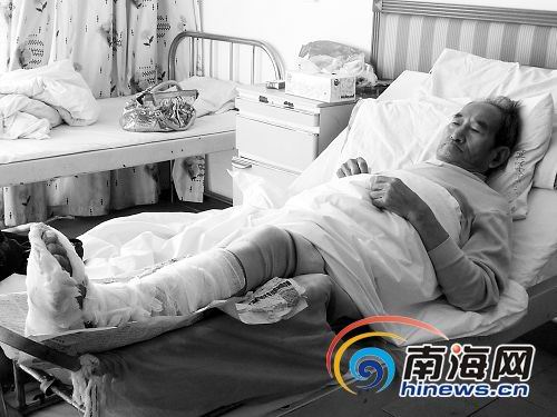 3日下午,記者在海南邊防醫(yī)院見到了受傷的張老漢。老人躺在病床上,左腳纏了繃帶并用木板固定住。張老漢回憶說,1日下午4點左右,他在博愛南路過馬路,打算去附近的東湖站臺乘坐剛到站的36路公交車。這時,一輛開往博愛南路方向的摩托車緊貼著他的身子急速行駛過來。摩托車后輪的輻條將他的左腳“拐”進車輪內(nèi),他覺得一陣鉆心的疼痛。“之后,我被拖行了2米多,摩托車才停了下來,我趁機將腳抽出來,司機卻開著車跑了”。張老漢氣憤地說。