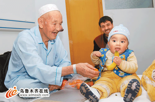 老人說,自己是阿克蘇烏什縣的農(nóng)民,身份證上顯示95歲,實際上自己今年已經(jīng)103歲了。他共有12個子女,其中有9個已經(jīng)辭世,最小的兒子今年36歲,現(xiàn)在共有11個孫子孫女,最小的孫子目前不滿1歲。