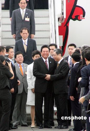 圖為陳云林步出包機(jī),與前來(lái)接機(jī)的海基會(huì)常務(wù)副董事長(zhǎng)高孔廉握手。