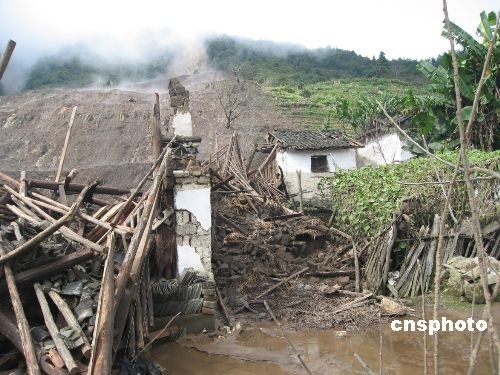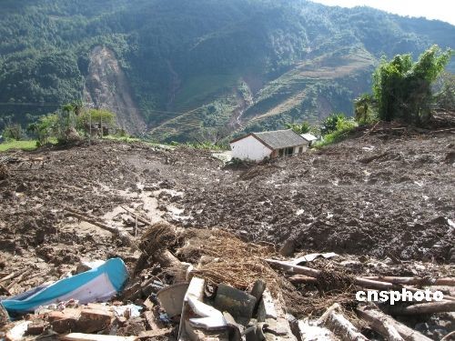 圖為泥石流過后,新華村下屬一村民小組被夷為平地,山坡上只剩下一間民房的屋頂還依稀可辨。中新社發 劉子倩 攝