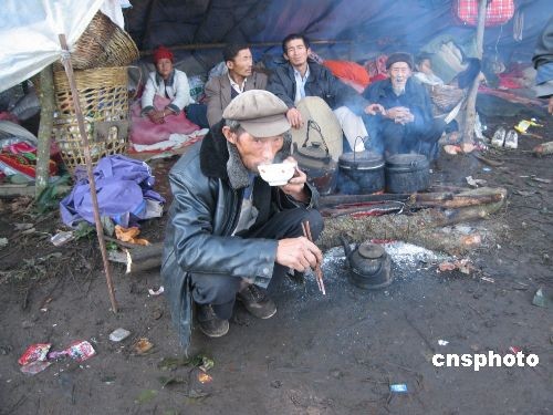 圖為十一月六日,被緊急安置的村民們在救災帳篷前吃早飯。中新社發 保旭 攝