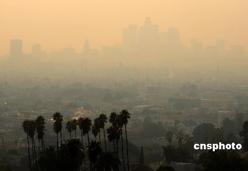 圖為洛杉磯市中心煙霧彌漫,能見(jiàn)度極差。中新社發(fā) 張煒 攝