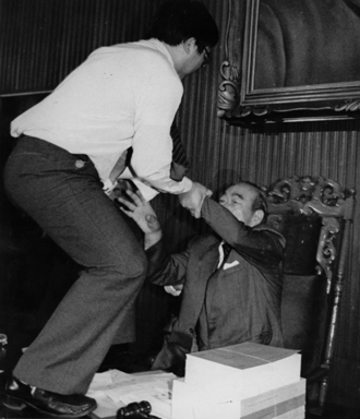 待劉闊才又握住一支麥克風,準備作裁定時,朱高正在高喊“我要求辯論”后雙手一撐,翻上主席臺,以雙手扭扯主席劉闊才,劉闊才在座位上搖搖晃晃,險象環生。
